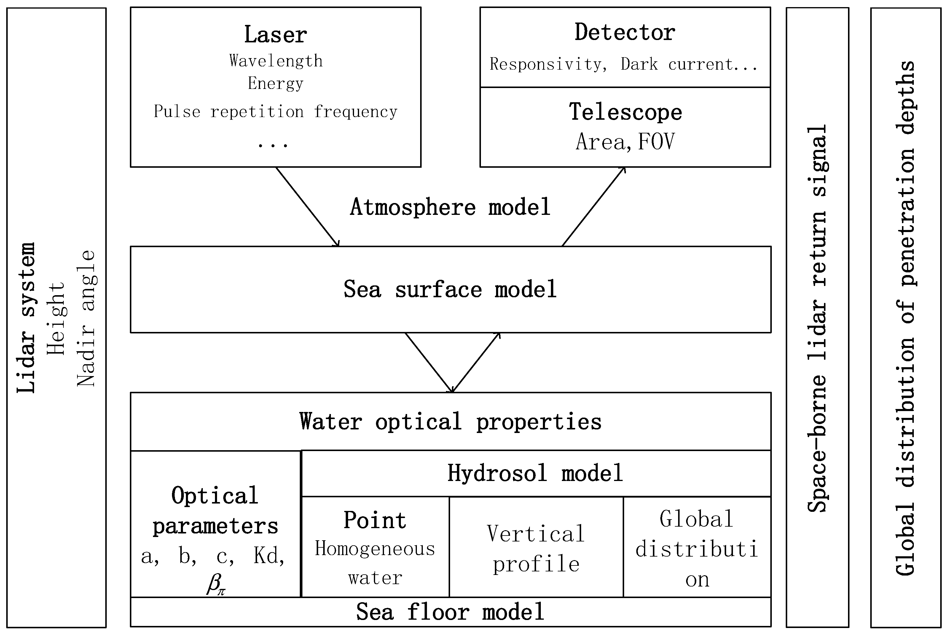 - Liu, Q.; Liu, D.; Zhu, X.; Zhou, Y.; Le, C.; Mao, Z.; Bai, J.; Bi, D.; Chen, P.; Chen, W.; et al. Optimum wavelength of spaceborne oceanic lidar in penetration depth. J. Quant. Spectrosc. Radiat. Transf. 2020, 256, 107310. [Google Scholar] [CrossRef]