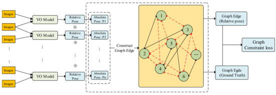 Figure 3 shows the computation of graph loss. To construct the graph, a window is used to slide over the image sequences. Firstly, the image sequences were fed into the model to predict the relative pose. Then the relative pose was used to calculate the absolute pose. Empirically, the window size was set to 15–20 images to improve the efficiency. For each window, a random strategy was selected to construct the edges of a graph and generate more relative edges from the absolute poses. For each iteration edges equal to four times the window size were randomly selected to further increase the efficiency. The random strategy can prevent the network from overfitting compared with using fixed edges. The graph loss leads to more edge constraints, which incur some computational costs. The computational cost of the loss component is still small compared to the total network computation.
