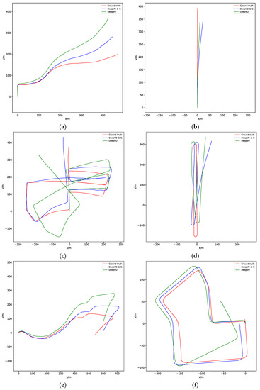 Since the absolute scale is not feasible to obtain from the monocular visual odometry, the localization results were manually aligned with the ground truth. Therefore, the scales of monocular VISO2 (VISO2-M) and SC-Sfmlearner were aligned to the ground truth for a fair comparison. The DeepVO was implemented referring to [7]. The network was trained under the same settings as DeepVO-Graph and DeepVO-Graph-Geodesic (DeepVO-G-G) for a fair comparison since there is no official public code available. DeepVO-Graph indicates the rotation loss term is computed with the angle in Euclidean distance manner, while DeepVO-Graph-Geodesic represents the rotation loss term is computed with the proposed geodesic distance (new rotation loss). In the experiment, DeepVO, DeepVO-Graph, and Deep-Graph-Geodesic were trained with sequences 00, 02, 08, 09, and tested with sequences 03, 04, 05, 06, 07, 10, as in [7]. SC-Sfmlearner was trained with sequences from 00 to 08 and tested with sequences 09, 10 [48]. TrajNet was trained with sequences 00–06 and tested with 07–10 [49].