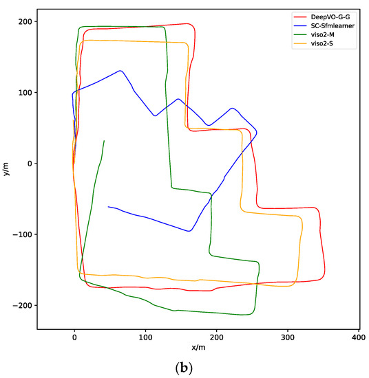 The scale of VISO2-M and SC-Sfmlearner is obtained by aligning to the VISO2-S. The results are shown in Figure 6. The DeepVO-G-G and VISO2-M perform better in sequence 11; the SC-Sfmlearner is poorer than the others. Sequence 15 is more challenging (longer distances and scene complexity) than sequence 11. However, the proposed method is closer to the VISO2-S than VISO2-M and SC-Sfmlearner on sequence 15, which demonstrates that the proposed method achieves better performance than the traditional monocular visual odometry and other deep learning-based methods.