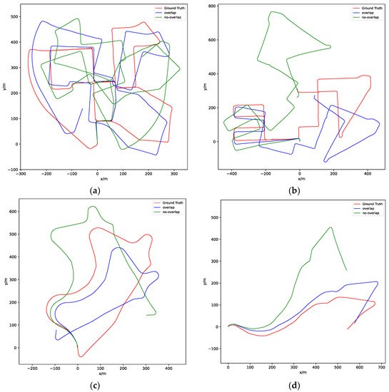 Comparison of sequence overlap and no overlap trajectories. (a) Sequence 00; (b) Sequence 08; (c) Sequence 09; (d) Sequence 10.