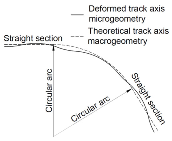 From the point of view of their geometry, the designed railway tracks have a precisely defined general shape, the so-called macrogeometry. This macrogeometry is implemented in field conditions when the track is built. During both the railway-track-building process and its further operation, certain differences appear between the designed and real geometry, which bear the name of microgeometry. The relationship between track macro- and microgeometry is shown in Figure 1.