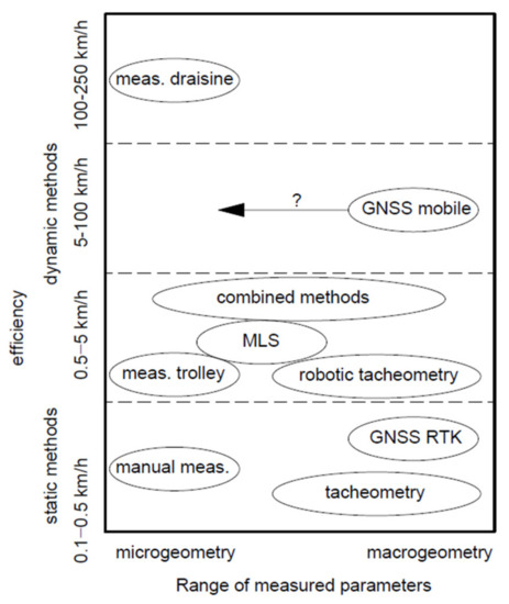 All these measurement methods make it possible to reconstruct track micro- or macrogeometry, but their efficiency differs considerably. In general, methods based on measuring local track parameters allow for the achievement of very good results of track microgeometry measurement and are very efficient. On the other hand, measurements making use of geodetic networks enable reconstructing of the track macrogeometry, but their efficiency is low, and they require the presence of an expensive and troublesome surveying grid. That is why many hopes rest on GNSS-technique-based methods, as they offer track macrogeometry measurements which are highly efficient and do not require an expensive surveying grid. However, it is still questionable whether these methods can be effectively used for assessing track microgeometry. Figure 2 presents a collation of typical measurement methods used in railway business.