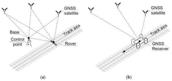 Measurement of railway track axis co-ordinates with two GNSS receivers (a) and MSM technique (b).