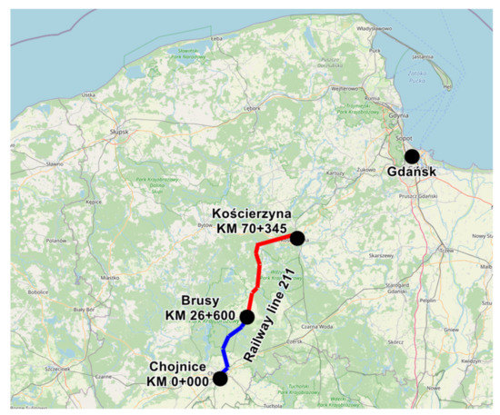 Due to relatively small traffic on railway line no. 211 (2 pairs of trains composed of light diesel trainsets SA-109), the geometry degradation during 2 years after the most recent maintenance works was expected to be negligibly small, and it could be assumed that in the next measurements the test segment would exhibit the same defects (the same macro- and microgeometry). The geographical location of the measured test segment is shown in Figure 4.