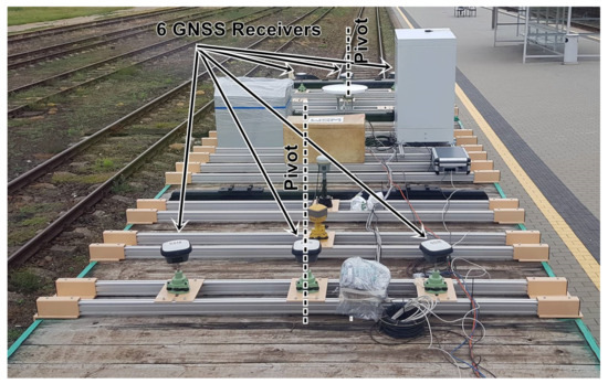 The GNSS receivers were mounted over the bogie pivot pins and in the lateral axis passing through the pivot pin. The configuration of the measuring instruments is shown in Figure 5, and their sample assembly in universal rails in Figure 6.