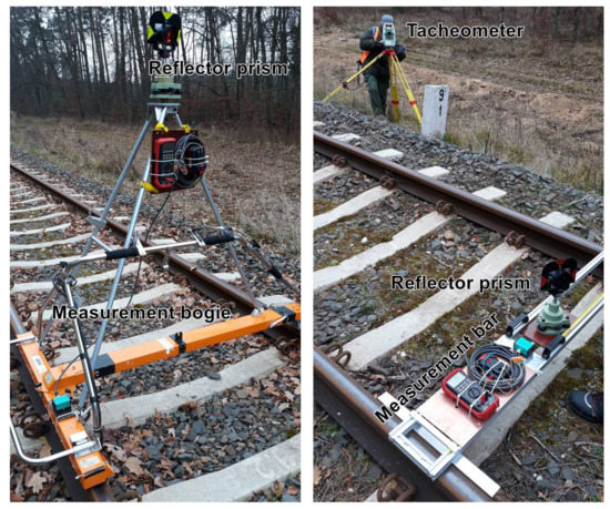 - Tacheometric measurements—determining track axis co-ordinates in relation to the railway control network (static or making use of trolleys and robotic devices) [32].
