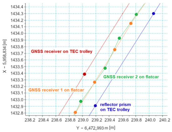 The mobile GNSS measurements consist of recording co-ordinates in given time intervals during the motion of the measuring trolley with a given speed. Hence, the distances between successive measuring points and the measured track position depend on the data recording frequency (in the reported research, the measuring frequencies were 1 Hz, 20 Hz, and 100 Hz) and the measuring trolley speed (5–70 km/h). Since not all configurations were utilized, the distances between points measured using the GNSS methods can vary: