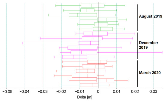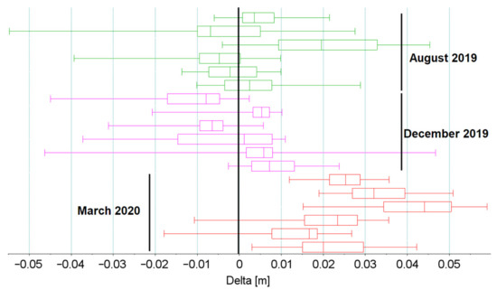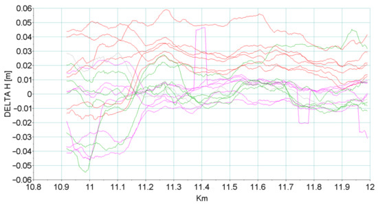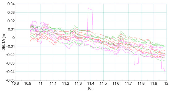 Table 1 and Figure 13 and Figure 14 show statistical parameters (median MED and standard deviation STD) describing differences in the track axis reconstructed in successive measuring campaigns using particular receivers. These parameter values made the basis for assessing the quality of track axis reconstruction using the MSM method.