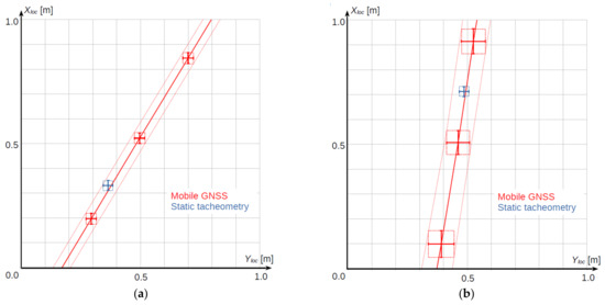 Figure 15 presents a comparison of the results obtained for particular measurement systems, along with the corresponding uncertainty levels. As can be seen in Figure 15a, the GNSS measurements performed in good conditions provide results which comply with those obtained from the static method, as the areas defined by the expanded uncertainty levels for these two methods overlap each other. In Figure 15b, presenting the measurement results obtained in less favorable conditions, the compliance of the track axis position reconstructed using the two methods is still observed, although the expanded uncertainty level is higher in this case.