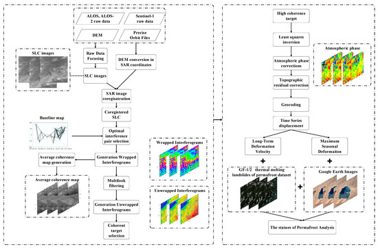 - Chen, F.; Lin, H.; Li, Z.; Chen, Q.; Zhou, J. Interaction between Permafrost and Infrastructure along the Qinghai–Tibet Railway Detected via Jointly Analysis of C-and L-Band Small Baseline SAR Interferometry. Remote Sens. Environ. 2012, 123, 532–540. [Google Scholar] [CrossRef]