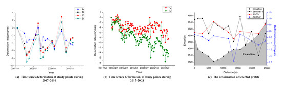 The time series deformation of the study points and the deformation of the selected profile. (a) Time series deformation of study points during 2007–2009. (b) Time series deformation of study points during 2017 to 2021. (c) The deformation of selected profile.