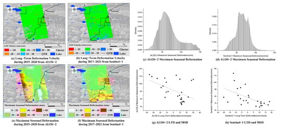 The long-term deformation velocity and maximum seasonal deformation. (a) Long-term deformation velocity during 2015–2020 from ALOS-2. (b) Long-term deformation velocity during 2017–2021 from Sentinel-1. (c) ALOS-2 maximum seasonal deformation. (d) Sentinel-1 maximum seasonal deformation. (e) Maximum seasonal deformation during 2015–2020 from ALOS-2. (f) Maximum seasonal deformation during 2017–2021 from Sentinel-1. (g) ALOS-2 LTD and MSD. (h) Sentinel-1 LTD and MSD.