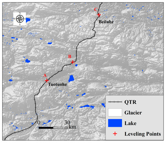 In addition, to evaluate the accuracy of the SBAS-InSAR results in this paper, we used leveling data from other researchers in the QTR [70]. The locations of the three leveling points are shown in Figure 8. The elevations of the three leveling points were collected on 9 January 2018, and 11 February 2018. The deformation results of 3 January 2018 and 8 February 2018, were extracted from 150-475 (Path-Frame) Sentinel-1 InSAR results. In order to ensure the accuracy, we convert the leveling results to the displacement of the LOS direction based on the radar incident angle. The comparison between the InSAR experiment results and the leveling results of A, B and C is shown in Table 7. Table 7 shows that the absolute errors of the leveling data and InSAR measurements at points A, B and C were 3.1, 5.7 and 6.8 mm, respectively, which were relatively small.