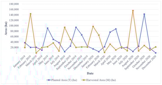 From the rice field extent and cropping calendar data in Table S1, an aggregated number of planted and harvested rice field areas in Peninsular Malaysia from 2019–2020 were generated and are shown in Figure 7. In 2019, the largest rice area was harvested in February at 143,980 ha, while in 2020 the largest area was harvested in August at 155,481 ha. There was an anomaly in April 2020 caused by the Kedah-2 cluster, which had 5 months of growth. The planting period was in April and the cluster was harvested in August over 54,782 ha. This shift was caused by rice fields that were planted at the end of April 2020 and the beginning of May 2020 and were harvested at the same time in August 2020. In 2019, Kedah-2 had 4 months of growth that started in May and finished in August. As a result, the harvested rice area in 2019 was 458,064 ha, while in 2020, it increased to 460,388 ha.