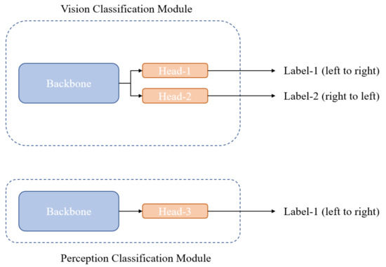 The architecture of our proposed model is shown in Figure 3 and Figure 4. The LLNet consists of two modules, a vision classification module and a perception classification module. The vision image and its perception counterpart are sent into the corresponding classification module, respectively. Additionally, the heads output the classification probability distribution. There are some differences in forward propagation between the training process and the inference process. In the training process, the output from each head in the vision classification module corresponds to its own label and calculates the loss by adding a step with a corresponding weight (as shown in Section 3.3). In the inference process, only a single head in each module outputs the result and merges the result from the perception module, predicting the final result based on the merged value.