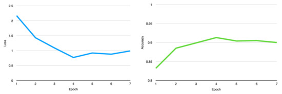 The training process of LLNet is pretty fast, and the convergence is usually reached within 4 epochs. As shown in Figure 7, the loss decreases rapidly with the increase in epochs, while the accuracy considerably improves as the training process proceeds. However, overfitting is a problem that needs attention. In our experiments, overfitting is not severe due to the fact that the amount of the training set is over 270 thousand images and the network can learn the most important features of the train dataset. When the training set is relatively small, the overfitting problem is more severe. It is usually necessary to design models with better feature extraction ability to mitigate the overfitting problem.