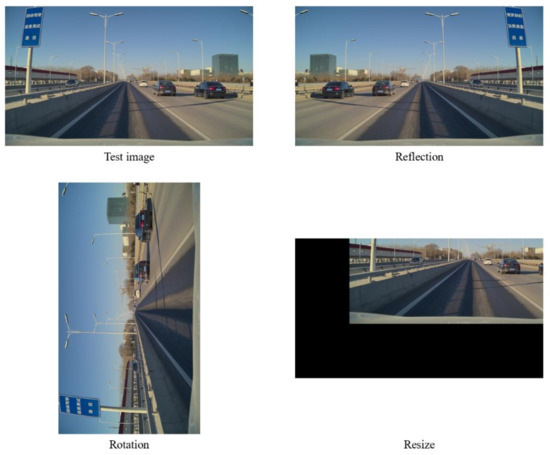 First, common data augmentation methods cannot be used because the images during the inference process do not have the same changes as the data augmentation, as shown in Figure 8. Additionally, data augmentation methods such as rotation within a small angle (Figure 9) can be used in the lane localization task, because the slight rotation of camera does happen as the auto-driving suite is continuously working. The key point of data augmentation is that the augmentation condition must happen in real-world applications.