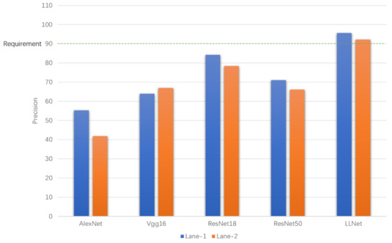 Second, the core features that lane localization relies on are lane marks and road edges. The high-level semantic features extracted by the classification baselines are helpful but not the most important for this lane localization task. This is a significant difference from the traditional classification task. As can be seen from Figure 10 and Figure 11, ResNet outperforms the other baselines (AlexNet and VGG). However, unlike the traditional classification and object detection tasks, ResNet18 is superior to ResNet50. This is because the lane marks, which are important for the lane localization task, are not mapped to the final feature map due to downsampling and convolution operations in the deeper network.