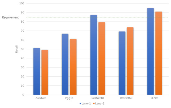 The results from Table 1, Table 2, Table 3, Table 4, Table 5, Table 6 and Table 7 show that our LLNet is significantly superior to the baseline classification network in terms of precision and recall metrics for all lane classes, which proves the effectiveness of our fuse strategy. It is worth noting that the classification results for all networks are significantly better in lanes 1 and 2 than in lanes 3 and 4. The reason for this contrast is the uneven distribution of data. In real-world scenarios, the number of roads with two lanes in one direction is much higher than the number of roads with four lanes in one direction, so the number of first and second lanes is much higher than the number of third lanes and third and fourth lanes. Since the generalization performance of the deep learning model is highly dependent on the amount of data, the network learns more features of the first two lanes, so the generalization performance will be better than that for lane 3 and 4.