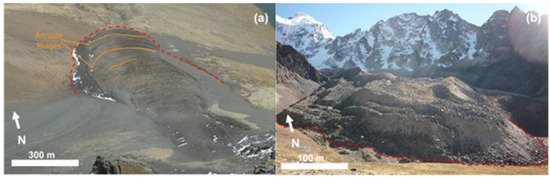 Terrestrial rock glacier Martian analogs. Bolivian rock glaciers; (a) well-defined arcuate ridges and depressions extent marked orange at Pico Austria, Tuni Condoriri region; (b) rock glacier front analog at Huayna Potosi, rock glacier with an over-steepened front slope ~43°. Photo credit: S Rangecroft, July 2011, August 2012.