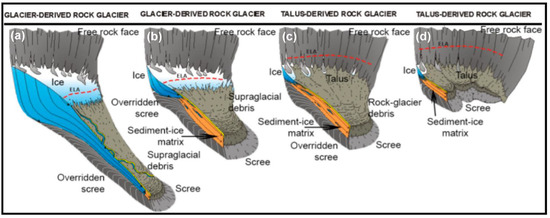 Glacier-derived rock glacier to talus-derived rock glacier examples. Images with higher elevation equilibrium lines (decreasing ice accumulation) towards the right. (a) Glacier-derived rock glacier, ELA present on glacial body; (b) glacier-derived rock glacier, ELA migrated up closer to rock face; (c) talus-derived rock glacier, ELA now above glacier body; (d) talus-derived rock glacier, ELA migrating further above glacier body. Figure adapted from Humlum et al. [81].