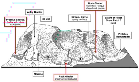 Three classifications of rock glaciers geometry; lobate rock glacier, piedmont/spatulate rock glacier and tongue-shaped rock glacier (indicated in red). After Humlum et al. [81], Martin and Whalley [74], and Hamilton and Whalley [84].