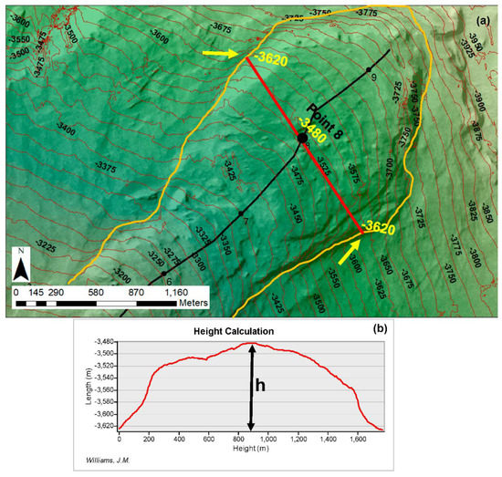 The underlying ground elevation below each lobate feature was derived by creating a perpendicular line through each transect point drawn to the edge of the lobate feature (Figure 7a). A line drawn connecting the ground elevations at endpoints of each perpendicular (yellow arrows Figure 7a) was used to estimate the ground elevation below each transect point. Maximum thickness at each transect point (h) was then estimated by subtracting the underlying ground elevation from the lobate spot elevation (Figure 7b). We did not include basal scouring and deepening effects as we believe these forms to be periglacial and therefore likely frozen to the underlying bedding at the time of formation.