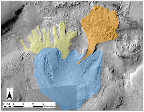 A lobate feature complex and associated mass wasting deposits on the north face of Mount Sharp (Figure 1c,d) extends nearly to the floor of Gale crater [42]. The complex appears to originate north of a concave depression, located close to the summit of Mount Sharp [38,42,43], and consists of at least 11 discrete lobate features that display a range of preservation states, from pristine forms to highly degraded remnants. The stratigraphically higher lobate features mantle other more degraded lobate features, suggesting multiple episodes of activity. La Deit et al. [37] suggests that the lobate deposits formed after the deposition of the early Hesperian Syu1 unit, which they overly at their western edge, and before the deposition of the late Hesperian to Early Amazonian Cyu and Bu units. Le Deit et al. [37] and Fairén et al. [38] have suggested that these lobate features could have had an origin as rock glaciers, but to date, no quantitative analysis using morphometric data has been conducted to test this hypothesis.