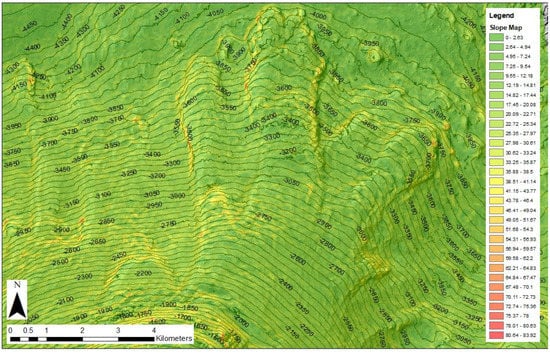 Active rock glacier distal slopes are typically over-steepened (Figure 3b), with slopes of up to 40–45° [76]. Source zones are associated with the heads of steep-walled valleys and are typically part of a wide amphitheater-like catchment, such as a cirque basin or nivation hollow [73,77,78] (Figure 4). The ice/water accumulation zones of these features are associated with scree-covered slopes at the base of a cliff or steep rocky headwall that have accumulated through periodic rockfall (Figure 4).