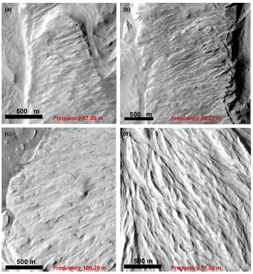 While the composition of the lobes is uncertain, they most likely comprise the capping Bu sedimentary unit aeolian lithologies, identified by Le Deit et al. [37] and Anderson et al. [52]. Analysis of lobate feature surface roughness indicates that the surfaces have few boulders and, in general, display a relatively smooth texture. Past studies [38] have suggested that, on a coarser scale, and similar to terrestrial rock glacier analogs, the lobate surfaces exhibit arcuate ridges, furrows and a wrinkled pattern, consistent with pressure ridges (Figure 2 and Figure 3). However, on further study, the aforementioned wrinkled pattern or pressure ridges texture are not arcuate, but rather appear to be linear, finely lamented features, similar to that of the nearby Light-Toned Yardang Unit (LTYu) [104] (Figure 11). Further, the average spacing between ridges is virtually identical, on average ~93 m (Figure 11). This suggests that the pattern seen on the lobate features are actually aeolian reworking of the surface and not pressure ridges associated with rock glaciers.