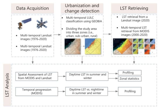 The advancement of geographic information science/systems (GIS) and the spectral and temporal resolution of the available satellite images allow researchers to assess the effect of the surface UHI across large areas historically and spatially. Several techniques for image classification using multispectral satellite imagery are available and widely used, such as Landsat and Moderate Resolution Imaging Spectroradiometer (MODIS). The LST measurement changes spatially and temporally, and therefore the LST must be evaluated for different land classes over various time frames for a thorough investigation. The required LST data are usually derived from thermal infrared bands using remote sensing data [29,30,31]. Several studies utilized LST retrieved from a wide range of satellites with different spatial resolutions [32,33,34,35,36,37,38].