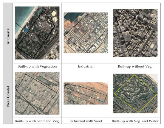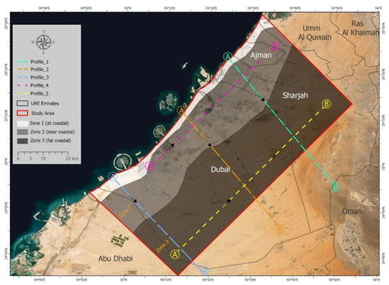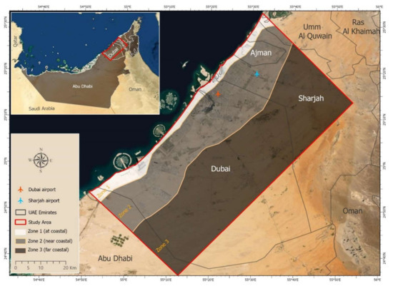 The coastal areas of the UAE were considered for UHI analysis. The study area includes the cities of Dubai, Sharjah, and Ajman (Figure 2). Dubai is the business capital of the UAE and its largest city. Dubai is approximately 4100 km2, with a population of more than 3 million [49]. On the other hand, Sharjah is the cultural and industrial capital of the UAE. With over 1.5 million residents over an area of approximately 230 km2, Sharjah has the highest population density in the UAE [50]. Finally, Ajman is the smallest emirate in the UAE but has a fast-growing economy with a high demographical evolution [51]. As illustrated in Figure 2, the study area is divided into three zones: at-coastal (distance from the coast is about 2.5 km), near-coastal (distance from the coast is about 20 km), and far-coastal zones (distance from the coast is about 46 km). This division was achieved according to two criteria. The first criterion is related to the proximity of the area to the coast, and the second one pertains to urban development status (urban versus rural areas). However, it is essential to mention that the division was not based on a quantitative measure but rather on the subjective estimation of the proximity distance, as well as our expert opinion about the study area.