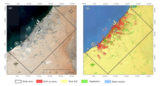 Since the establishment of the UAE in 1971, the country (in general) and the study area (in particular) have experienced rapid urbanization and industrialization because of oil discovery and the urban planning policies of its leadership. In Dubai, Khalil et al. [48] studied the city’s urban sprawl from the early 1970s until 2015. They showed that urbanization and population increased dramatically by 5- and 12-fold, respectively. In Sharjah, Al-Ruzouq et al. [50] performed a change detection of the built-up area in the city. They confirmed that the urbanization area of Sharjah almost quadrupled during 1976–2016. Al-Ruzouq et al. [51] investigated the urban growth in Ajman. Their results indicated the urban areas in Ajman increased by approximately 12-fold from 1975 to 2015. Generally, the selected study area is one of the fastest-growing regions with one of the highest urbanization rates in the world.