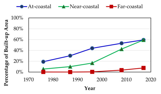 Figure 5 shows the assessment of the temporal built-up increase across the study area divided into three predefined zones: at-coastal, near-coastal, and far-coastal sections. The at-coastal zone was the most urbanized zone compared to other zones. In 2017, the urbanization of the at-coastal zone matched that of the near-coastal zone, with both scoring an urbanization rate of 59% of their built-up area (notice the trend within the shaded box in Figure 5). This outcome shows that the rate of urbanization in the near-coastal zone was faster than that of the at-coastal zone. The reason behind this circumstance is that urbanization started earlier in the at-coastal and near-coastal zones as compared to that in the far-coastal zone. The far-coastal zone had the lowest urbanization rate and percentage of built-up area. In 1976, the far-coastal zone was a bare desert with zero percent urbanization.
