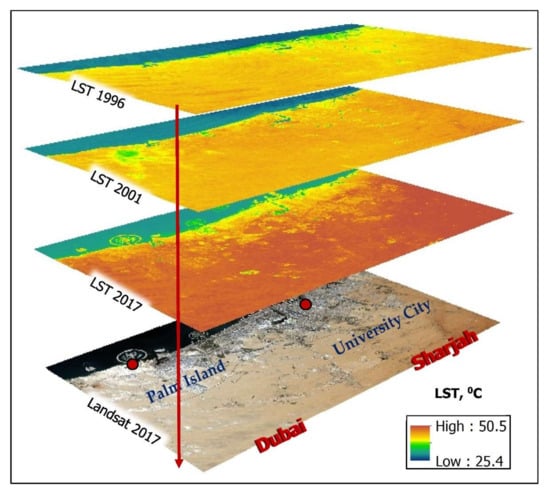 To assess and validate the accuracy of the retrieved LST maps, a comparison between LST and the near-surface temperature was conducted in two selected areas, i.e., the weather station of Sharjah International Airport and Dubai International Airport (Figure 2). Figure 10 shows the temperature difference between the LST at Sharjah and Dubai Airports’ weather stations and the actual temperature retrieved from these stations. As expected, the LST is always higher than the near-surface temperature. Nevertheless, the temperature difference was not consistent at the two locations. This observation was also indicated in the literature as other studies found that the temporal contrast of near-surface temperature and LST is not necessarily consistent [66]. The maximum difference scored was at Sharjah Airport in 2017 with a temperature difference of about 5 °C. On the other hand, the minimum difference was also at Sharjah Airport in 1996, with a temperature difference of about 0.5 °C. The mean difference between the LST and near-surface temperature of both airports over the years is 2.89 °C. It is essential to mention that previous studies for the same region indicated a strong correlation between the LST and near-surface temperature, reaching 0.9 [67].