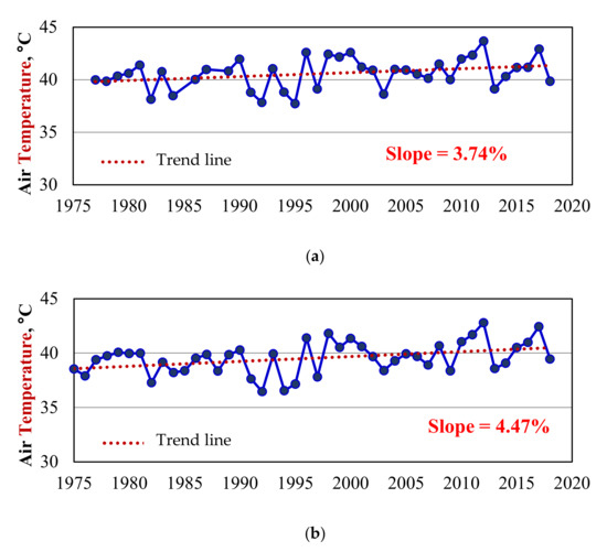 Yearly Average Near-surface temperature at 11:00 a.m. from July 15 to August 5. (a) Sharjah International Airport; (b) Dubai International Airport.