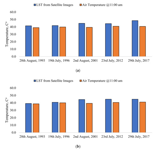 Exploring how the near-surface temperature changed during the last five decades is important to illustrate the changes in the LST. The last five decades in the UAE have witnessed an economic and development boom following the oil discovery that resulted in the urbanization sprawl. The UAE community changed from distant villages into modern dense metropolitan cities with many megastructures and modern infrastructure. Of course, this development had side effects on the local environment, and one of these effects is the changes in LST and near-surface temperature. Figure 9 summarizes the temporal annual near-surface temperature retrieved from weather stations located at two major airports in the study area, i.e., Dubai International Airport and Sharjah International Airport (Figure 2). To account for the selected dates of the LST maps at the passing time of the Landsat satellite, the average temperature was taken at 11:00 a.m. from 15 July to 5 August. In Figure 9a, one can observe that there is an increasing trend in the near-surface temperature at Sharjah International Airport at a rate of 3.74%, which can be translated to 0.37 °C every ten years. On the other hand, the near-surface temperature at Dubai International Airport’s weather station shows an increase of 4.47%, which is equivalent to 0.47 °C every ten years (Figure 9b). Hence, the study area has experienced a rise in the near-surface temperature similar to other regions in the world (because of the climate change effect). This increase is expected to affect the LST by default and the UHI phenomena in the study area. This temperature increase was tested using the t-test. For the records of Sharjah airport, the temperature of the summer of 1980 was compared with the records of the summer of 2018 using the t-test. The resulted p-value shows a statistical significance of 99% with a p-value < 1).