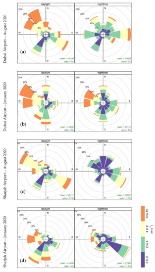 Wind Rose Ground Stations in the Study Area. (a) Dubai Airport—August 2020, (b) Dubai Airport—January 2020, (c) Sharjah Airport—August 2020, (d) Sharjah Airport—January 2020.