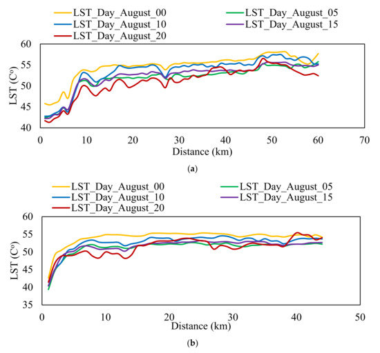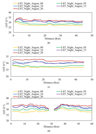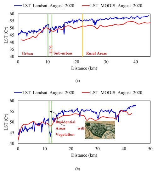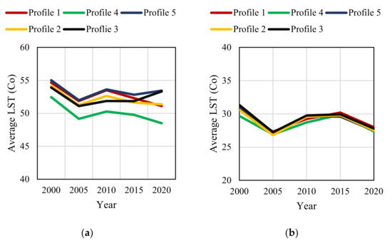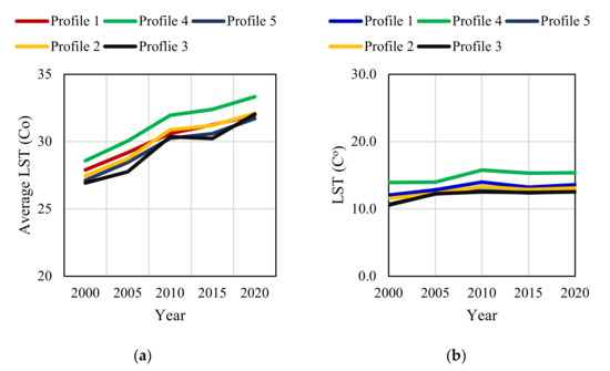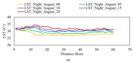 Accordingly, a similar analysis was performed for nighttime LST during the winter. To have a comparative assessment of how the nighttime LST changed between summer and winter, Figure 21 shows the average nighttime LST in both seasons (summer: August, and winter: January) for the three profiles shown in Figure 12. As shown in Figure 21a, the nighttime LST increases temporally in the summer seasons. However, the nighttime LST (Figure 21b) is somehow stable temporally in the winter seasons. It is essential to highlight here that the increase in the nighttime LST is compatible with the near-temporal increase in the near-surface temperature illustrated earlier in Section 4. This observation coincides with other studies in the literature that showed that nighttime LST is generally more compatible with near-surface temperature than daytime LST [68,69]. It is important to highlight that the standard deviation ranged between 0.4 and 1.2 °C in 2020.