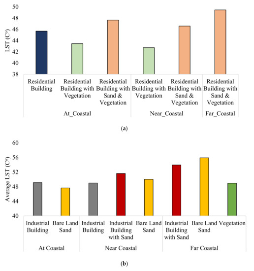- The zonal statistics of the summer LST showed that areas with industrial buildings have generally higher temperatures than areas with residential buildings. Furthermore, the presence of bare sand in urban areas has a relatively higher LST than in areas that are fully urbanized (facilities with/out vegetation).