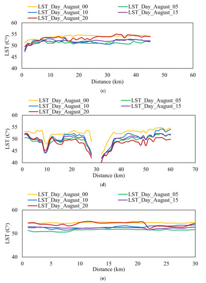 Temporal Profiling of Daytime LST in Summer Seasons. (a) Profile 1; (b) Profile 2; (c) Profile 3; (d) Profile 4; (e) Profile 5.