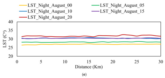 Temporal Profiling of Nighttime LST in Summer Seasons. (a) Profile 1; (b) Profile 2; (c) Profile 3; (d) Profile 4; (e) Profile 5.