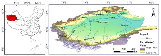 Sketch map of the Tarim River Basin, China. The map is from the Chinese Standard Map (http://bzdt.ch.mnr.gov.cn/GS (accessed on 11 April 2022) (2019)1822).