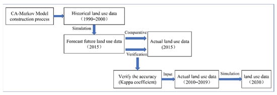 In this study, land-use data from 1990 and 2000 are used to predict the land use of the Tarim River Basin in 2015 through the CA-Markov module in Idrisi17.0 software. The results are compared with actual land-use data for 2015 to verify the reliability of the CA-Markov model simulation. Finally, the spatial data of land use in 2030 are predicted, with 2010 as the starting year (Figure 2). All images processed in Idrisi software are raster data. The size of the land raster used in this paper is 30 m × 30 m, and spatial data processing is completed in ArcGIS software.
