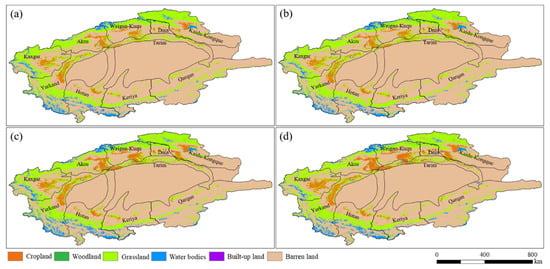 Land uses in the Tarim River Basin from 1990 to 2019: (a) 1990; (b) 2000; (c) 2010; and (d) 2019.