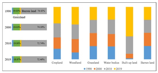 During 1990–2019, significant changes in land use occurred in the Tarim River Basin (Figure 3). There was an increase in cropland area of 18,850.51 km2, with a growth rate of 56.13%. The main areas of increase are as follows: the middle and upper reaches of the Tarim River Basin, the lower reaches of the Kashgar River, the lower reaches of the Aksu and Weigan–Kuqa rivers, and the middle and lower reaches of the Kaidu–Kongque River, with a small portion in the Hotan River. The barren land area decreased by 20,597.29 km2; the decrease was especially obvious in the middle reaches of the basin. Meanwhile, the woodland and construction land area increased by 1015.36 km2 and 2772.21 km2, respectively, mostly in the upper and middle reaches of the basin, and grassland and water body area decreased slightly (The changes in area of different land use types were shown in Table S1 in the Supplementary Material). Overall, the ranking of different land-use/cover types in the study region, except for woodland and construction land (two land types with a small area base), has remained relatively constant, showing barren land > grassland > cropland > water bodies (Figure 4).