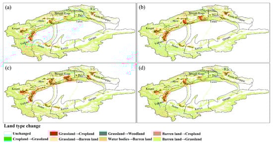 Land-use transfer map of the Tarim River Basin from 1990 to 2019: (a) 1990–2000; (b) 2000–201; (c) 2010–2019; and (d) 1990–2019.