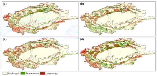 Changes in ecological environment in the Tarim River Basin from 1990 to 2019: (a) 1990–2000; (b) 2000–2010; (c) 2010–2019; and (d) 1990–2019.