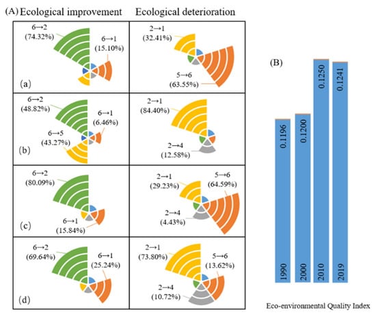 Ecological contribution of the Tarim River Basin (1990–2019). (A) Contribution rate of land conversion among different land types to ecological environment: (a) 1990–2000; (b) 2000–2010; (c) 2010–2019; and (d) 1990–2019 (1. cropland; 2. grassland; 3. woodland; 4. built-up land; 5. water bodies; and 6. barren land). (B) Eco-environment quality index of the Tarim River Basin (1990–2019).
